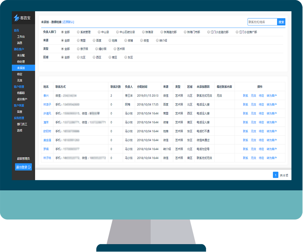 影艺行业客咨管理系统,私有部署,数据更安全;专业化,为影艺行业客咨管理专业定做;流程化,让客咨流向更清晰明了。